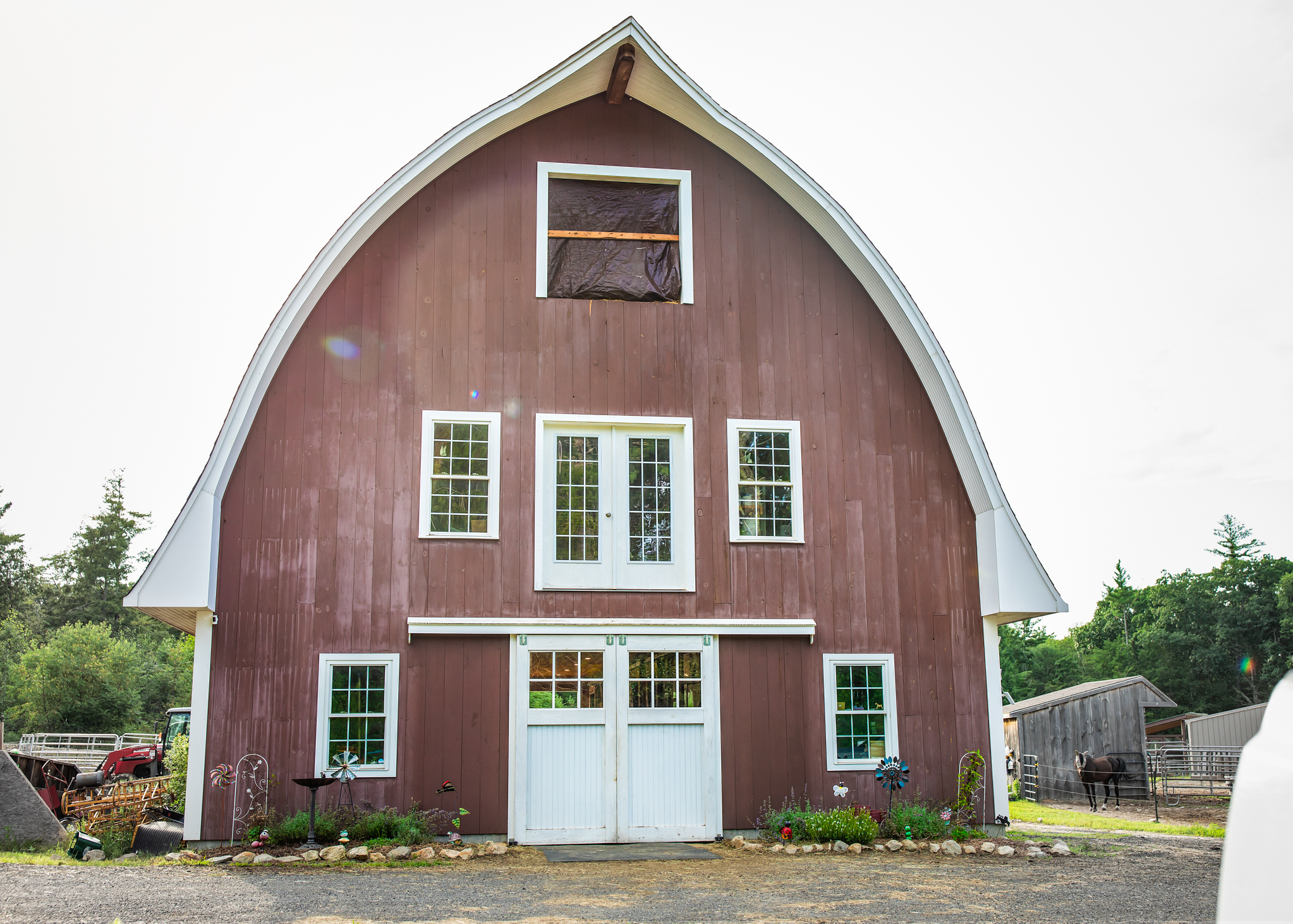 She and her husband Andrew found and purchased this land with the dream of having the horses be at home and having a small backyard farm. Now with their six wonderful children their dream is becoming a reality. The barn was made possible thanks to Andrew's extraordinary talent and vision. He painstakingly constructed the stunning building we have today using salvaged materials from an old barn that he disassembled, but it was a lengthy process and is still undergoing construction.