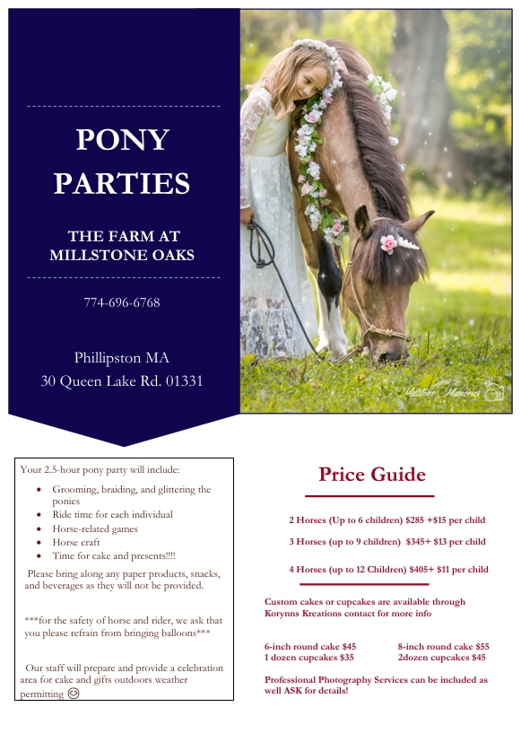 On the farm, parties are SO much fun! Pony rides, games, crafts, and soooo much more...